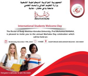 l’Université Badji Mokhtar organise une cérémonie Welcome Day en l’honneur des étudiants internationaux. Cet événement se tiendra le mercredi 19 novembre à 11h, à l’auditorium Abou Bakr Belkaid, au pôle universitaire de Sidi Amar.
