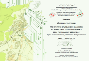 Université Badji Mokhtar Annaba Faculté des Sciences de la Terre Département d’Architecture Organisent SÉMINAIRE NATIONAL ARCHITECTURE ET URBANISME EN ALGERIE AU PRISME DE LA TRANSITION DURABLE ET DE L’INTELLIGENCE ARTIFICIELLE Enjeux environnementaux, patrimoniaux et de gouvernance 20 & 21 Avril 2026 Annonce_Séminaire_2026 Programme du Séminaire en Architecture – Annaba – Avril 2026