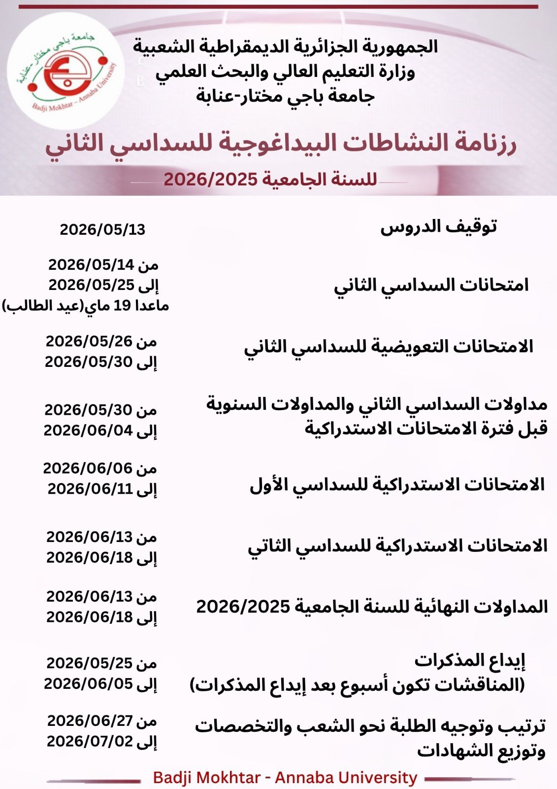 في إطار تنظيم نهاية السنة الجامعية 2026/2025، تُعلن نيابة مديرية الجامعة للتكوين في الطورين الأول و الثاني والتكوين المتواصل والشهادات عن الرزنامة الخاصة بالأنشطة البيداغوجية لاختتام السنة الجامعية 2026/2025.